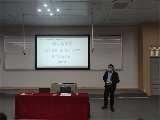为进一步提高全体学生安全防范意识,确保学校的安全与稳定,防止各类事故的发生,同时为建设“平安校园”创造良好的安全环境而努力,区块链学院于5月8日晚在C106召开“安全隐患大排查工作部署暨消防安全知识宣读”会议,会议由学院学工书记郭远峰主持。