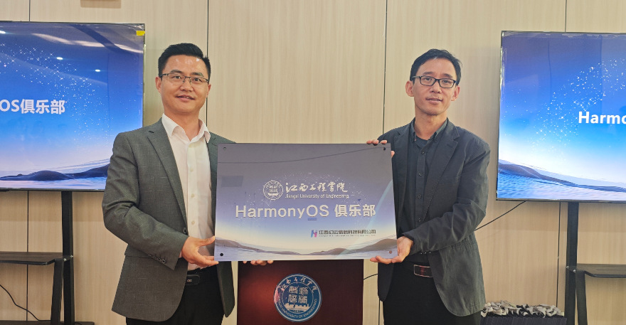 随后进行的HarmonyOS俱乐部授牌仪式将活动推向高潮。江西幻云信息科技有限公司总监陈康与智慧产业学院院长万为清共同完成授牌,标志着该校首个鸿蒙技术主题俱乐部正式成立,为学子们提供了持续深入学习和实践的平台。仪式后,全体人员合影留念,记录下这一具有纪念意义的时刻。