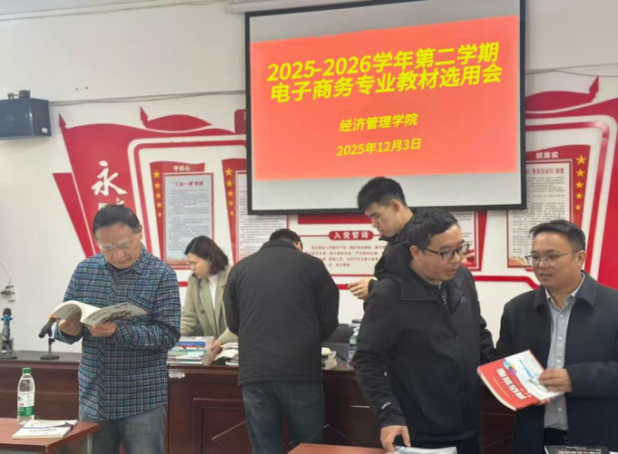为进一步规范教材选用工作,保障教学工作平稳有序开展,切实提升教学质量与育人实效,2025年12月3日,经济管理学院以教研室为单位在B201等会议室召开2025-2026学年第二学期教材选用会,会议由教研室主任主持,全体教师参加会议。教务处副处长吴逸人协同质评处、宣传部工作人员进行现场指导。