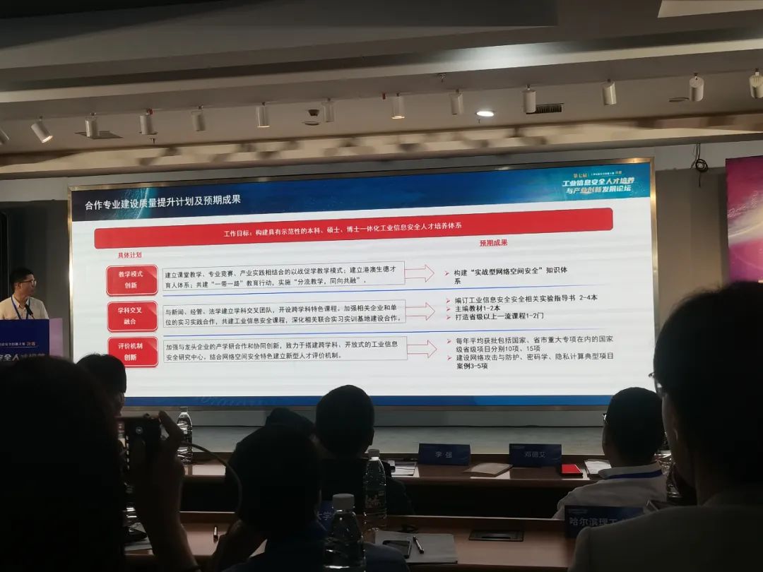 最后,通过此次研讨会的深入学习,今后我院将按照专项行动重点任务要求及时启动相关工作,以加快建设工业信息安全人才队伍为目标,以提升工业信息安全能力为宗旨,以培养高素质技术技能人才为主线,以提升学科与专业建设内涵和学生全面发展为导向,引导优质产业资源向学生聚集,促进产教融合、科教融汇,以人才引领和支撑产业高质量快速发展。
