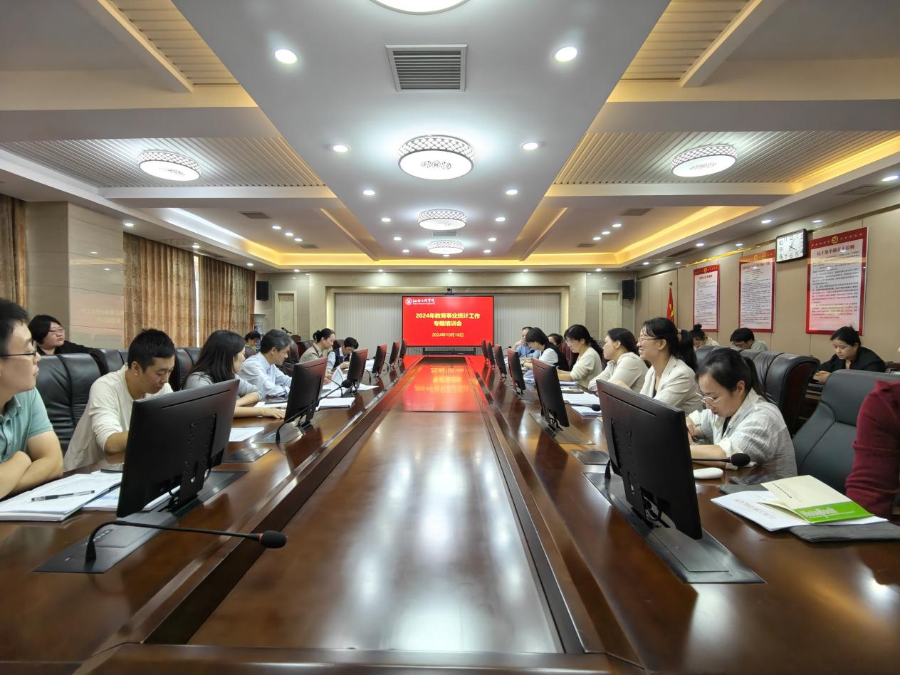 为贯彻落实省教育厅关于2024年教育事业统计调查工作部署会议精神,10月16日下午,我校在行政楼七楼会议室召开了工作启动暨业务培训会议。相关职能部门负责人、各教学院(部)负责人及数据填报员参加会议。质量与评估处处长主持会议并开展业务培训。