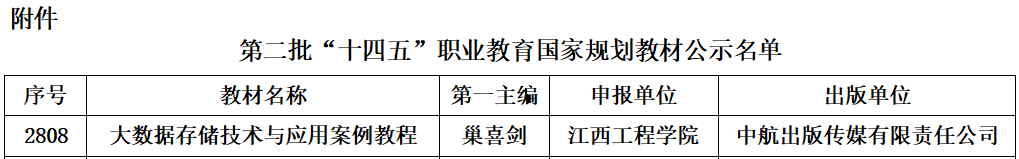 近日,教育部正式公示第二批“十四五”职业教育国家规划教材遴选结果。星空(xingkong)体育官方网站人工智能与数据科学学院巢喜剑教师团队主编的《大数据存储技术与应用案例教程》成功入选。这是学校首次跻身国家级规划教材行列,实现了教材类国家级标志性成果“零的突破”,标志着我校教育教学资源建设迈上新台阶。在此次遴选工作中,江西省同类本科高校仅2所院校的2部教材入选,星空(xingkong)体育官方网站赫然在列。
