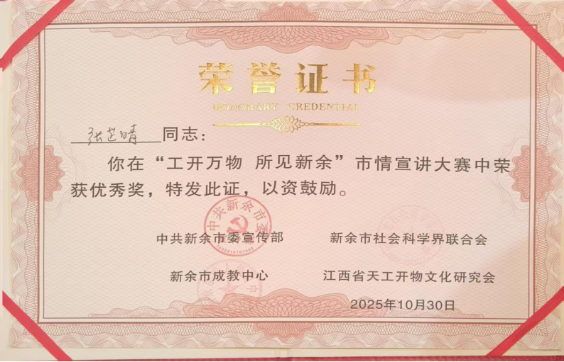 2025年10月下旬,由市委宣传部、市社科联、市成教中心、江西省天工开物文化研究会联合主办的“工开万物 所见新余”市情宣讲大赛经过一天角逐圆满收官。此次市情宣讲大赛以“天工开物 所见新余”为主题,旨在挖掘新余历史文化底蕴、展现城市发展活力,鼓励青年学子走进家乡、了解市情,用青春之声讲述城市故事。经济管理学院学子张芷晴凭借扎实的知识储备、生动的表达能力与深刻的市情理解,在众多参赛选手中脱颖而出,荣获大赛优秀奖,为学院争光添彩!
