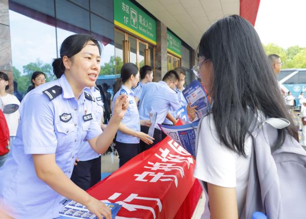 新余市公安局充分整合多方资源,组织反诈、交警、网安、禁毒、反恐、反邪等多警种专业力量,针对当前学生群体最容易遇到的电信诈骗、个人信息安全、网络谣言、安全出行、毒品危害等方面的问题,量身定制了这堂特殊的法治教育课。反诈中心民警结合典型案例详细讲解了当前刷单类诈骗、招工类诈骗、裸聊诈骗、网络交友类、冒充客服类等校园高发的诈骗类型,揭示不同诈骗的套路模式,梳理各类诈骗应对方法;禁毒大队民警以“拒绝毒品,珍爱生命”为主题,宣讲相关法律法规,展示了仿真毒品介绍新型毒品种类,通过涉毒案例讲述毒品的伪装性、迷惑性及吸毒的巨大危害性;交管支队在户外设置电动车科目二趣味路考——“S弯道巧穿行”,让学生们在实践中学习交通规则。在模拟驾驶体验区,学生们化身“小骑手”,按照“起步→观察→绕桩”的流程进行“虚拟路考”。在密集的铁桩阵中灵活穿行,模拟非机动车道避让行人和障碍物。“车身碰到铁桩扣10分!”民警严格判罚的同时,也不忘提醒学生“骑行要专注,方向控制稳”。这种寓教于乐的方式让交通安全知识深入人心。活动现场,户外摊位同步设置多个互动体验区。“我们希望通过这种沉浸式、体验式的宣传方式,让法治教育真正入脑入心。”参与宣讲的民警纷纷表示。