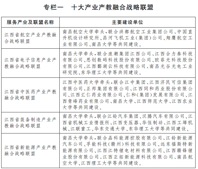 以推进十大产业发展为导向,以产业链条为纽带,由关联紧密的学科优势学校、行业龙头企业牵头,相关联的学校、企业、协会、研究机构等参与,建设“十大产业体系”产教融合战略联盟。通过统筹行业产业资源,全面深化产业与教育融合,以行业产业发展需求及新技术应用为牵引促进学科专业建设,以人才培养供给及科技研究转化为动能推进产业转型升级。联盟成员共享信息资源、交流行业经验、协同解决共性问题,共同推进行业发展。联盟属非盈利性、非法人性质的开放型联合体,实行实体化运作,定期开展活动。(责任单位:省教育厅、省发展改革委、省人力资源社会保障厅、省科技厅、省工业和信息化厅等部门按职责分工负责,各设区市人民政府)