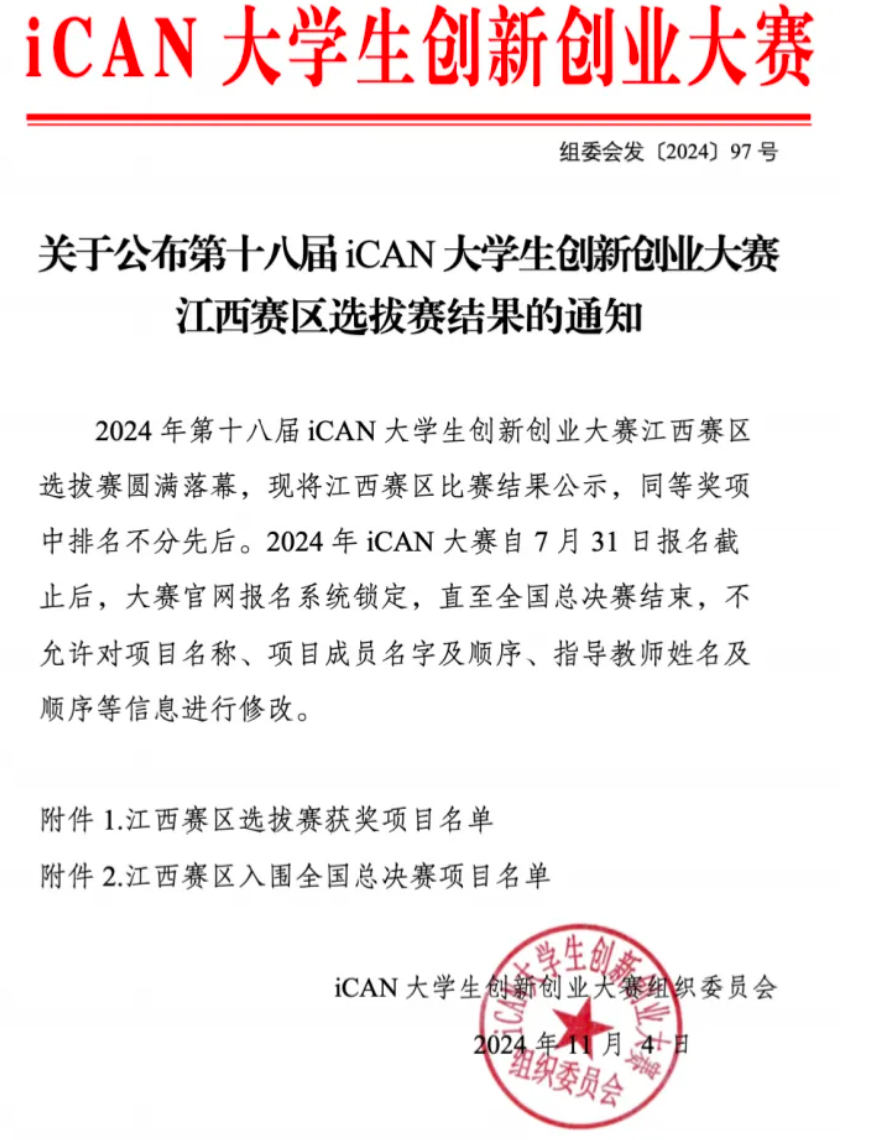 近日,第十八届iCAN大学生创新创业大赛江西赛区选拔赛在南昌大学循环经济产业封城研究院顺利举行,大赛旨在激发大学生的创新思维,培养创新创业能力,推动科技成果转化和产业升级。本次大赛由iCAN大学生创新创业大赛组委会与山东大学联合主办,由华东交通大学、江西理工大学等单位联合承办。