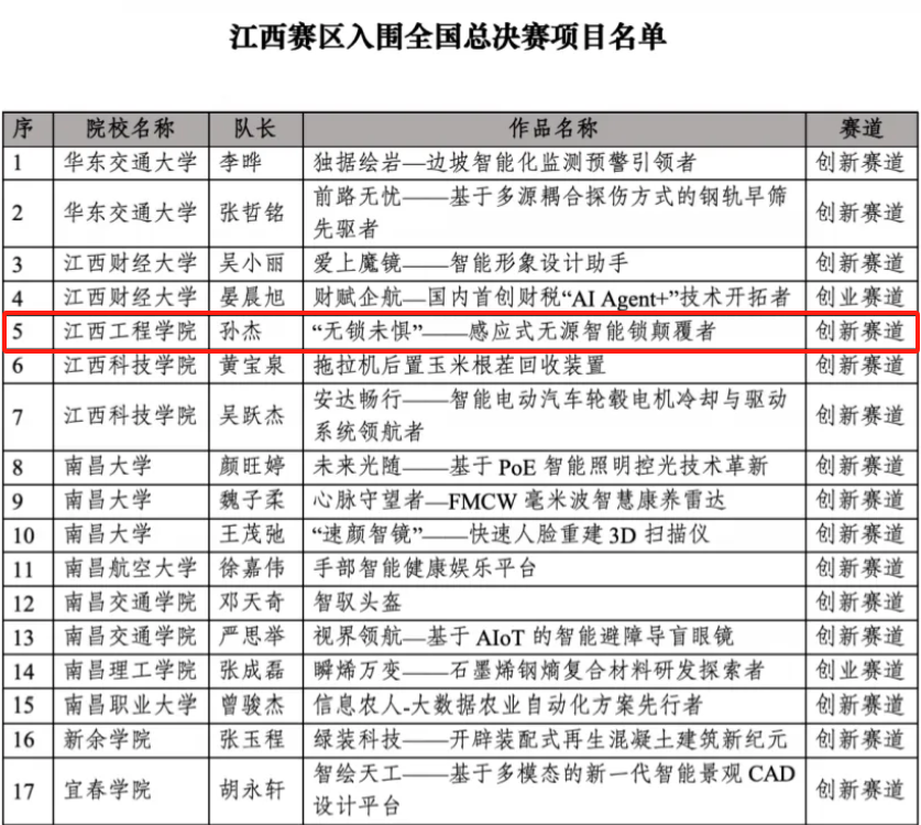 参赛选手围绕科技创新、社会服务、绿色发展等主题,精心策划并实施了多个具有前瞻性和实用性的项目。经过层层选拔和激烈角逐,最终斩获了一等奖1项、三等奖4项。其中“无锁未惧”——感应式无源智能锁颠覆者荣获全省一等奖且得分排名位列第1名,并入围全国总决赛。这一成绩的取得,不仅彰显了我校在创新创业教育方面的优秀成果和实力,而且也充分体现了学校师生对大学生创新能力培养的重视和艰辛努力的付出。